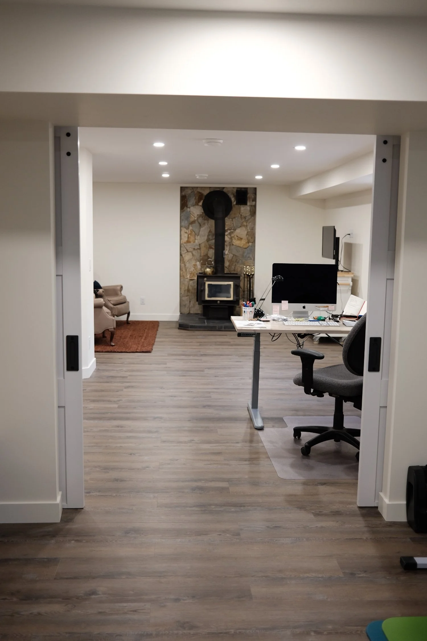Approach: Large barn doors allow two main spaces to be separate and then come together as one when opened. Custom ductwork minimized bulkheads allowing longer site lines and flatter ceilings.